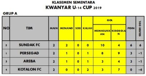 Sementara itu, di grup A, Sundak FC Sukolilo perkasa di puncak dengan poin sempurna, 9. Disusul Persegad Gading yang pada pekan ketiga juga meraih kemenangan atas Areba, 6-1.