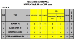 Dengan hasil ini, Cleopatra FC bertengger di puncak klasemen sementara grup B diikuti Blater FC dengan sama-sama mengoleksi 3 poin. Sedangkan Kampoeng FC berada di rangking 3 diatas juru kunci, Karanganyar FC.